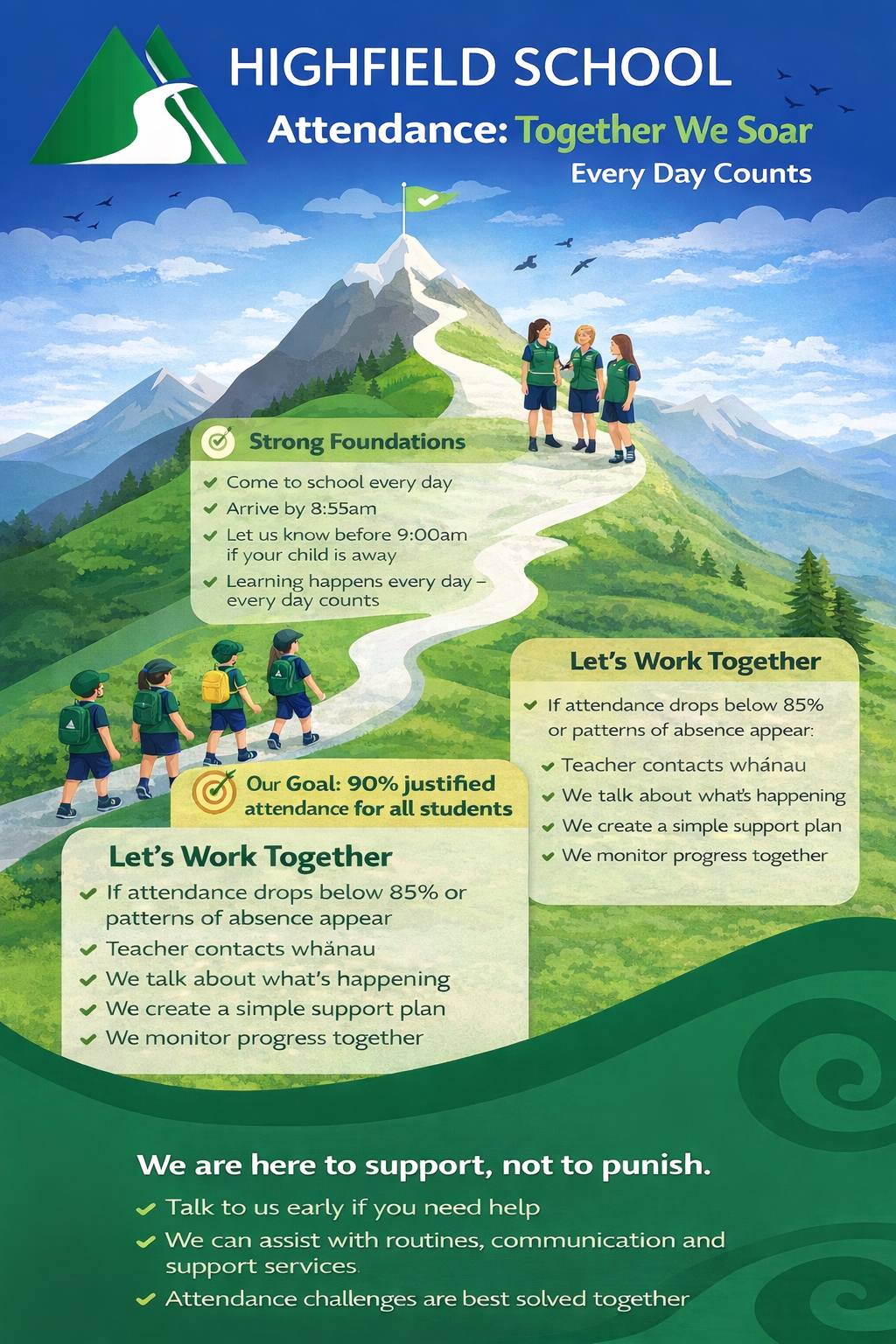 If you or your whānau are having any issues with school, encountering resistance to attend or have other problems getting to school please contact us as soon as possible.